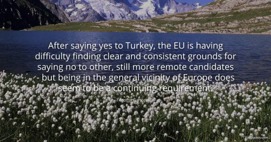 Ash, Timothy Garton. "After saying yes to Turkey, the EU is having difficulty finding clear and consistent grounds for saying no to other, still more remote candidates - but being in the general vicinity of Europe does seem to be a continuing requirement." FixQuotes. January 16, 2026. https://fixquotes.com/quotes/after-saying-yes-to-turkey-the-eu-is-having-107956/.