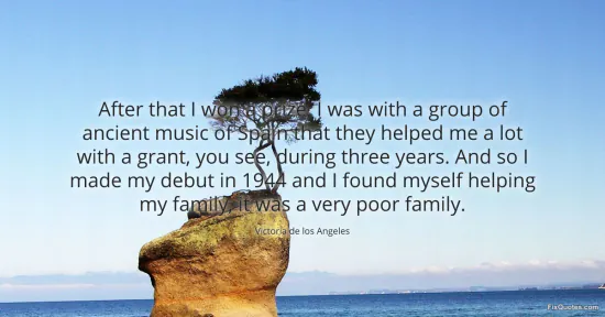 Angeles, Victoria de los. "After that I won a prize, I was with a group of ancient music of Spain that they helped me a lot with a grant, you see, during three years. And so I made my debut in 1944 and I found myself helping my family, it was a very poor family." FixQuotes. January 15, 2026. https://fixquotes.com/quotes/after-that-i-won-a-prize-i-was-with-a-group-of-154956/.