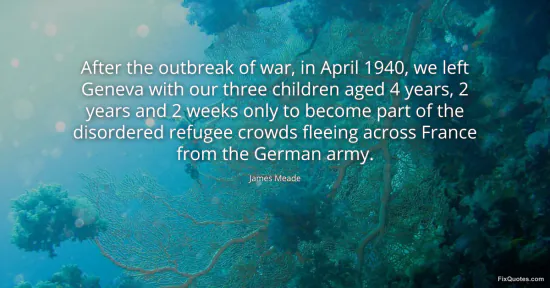 Meade, James. (2026, January 18). After the outbreak of war, in April 1940, we left Geneva with our three children aged 4 years, 2 years and 2 weeks only to become part of the disordered refugee crowds fleeing across France from the German army. FixQuotes. https://fixquotes.com/quotes/after-the-outbreak-of-war-in-april-1940-we-left-8131/