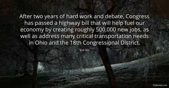 Ney, Bob. (2026, January 17). After two years of hard work and debate, Congress has passed a highway bill that will help fuel our economy by creating roughly 500,000 new jobs, as well as address many critical transportation needs in Ohio and the 18th Congressional District. FixQuotes. https://fixquotes.com/quotes/after-two-years-of-hard-work-and-debate-congress-73020/