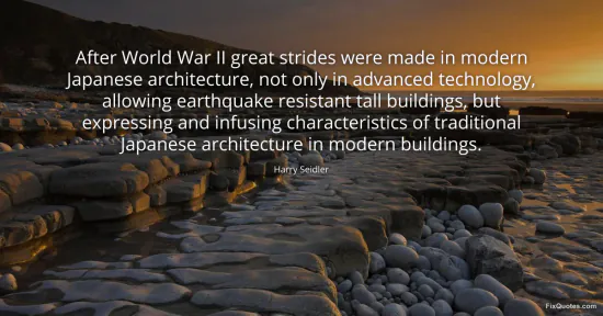 Seidler, Harry. "After World War II great strides were made in modern Japanese architecture, not only in advanced technology, allowing earthquake resistant tall buildings, but expressing and infusing characteristics of traditional Japanese architecture in modern buildings." FixQuotes. January 17, 2026. https://fixquotes.com/quotes/after-world-war-ii-great-strides-were-made-in-43715/.