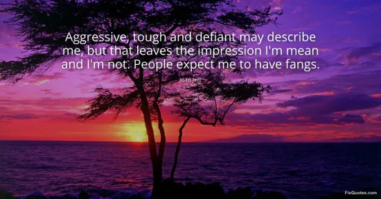 Jett, Joan. "Aggressive, tough and defiant may describe me, but that leaves the impression I'm mean and I'm not. People expect me to have fangs." FixQuotes. January 15, 2026. https://fixquotes.com/quotes/aggressive-tough-and-defiant-may-describe-me-but-156414/.