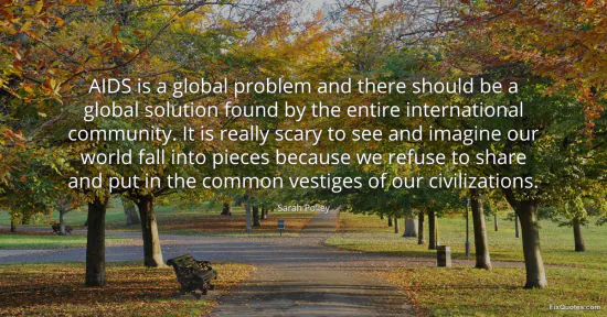 Polley, Sarah. "AIDS is a global problem and there should be a global solution found by the entire international community. It is really scary to see and imagine our world fall into pieces because we refuse to share and put in the common vestiges of our civilizations." FixQuotes. January 16, 2026. https://fixquotes.com/quotes/aids-is-a-global-problem-and-there-should-be-a-106631/.