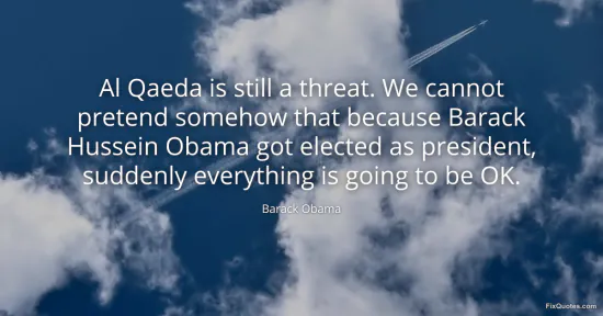 Obama, Barack. "Al Qaeda is still a threat. We cannot pretend somehow that because Barack Hussein Obama got elected as president, suddenly everything is going to be OK." FixQuotes. January 17, 2026. https://fixquotes.com/quotes/al-qaeda-is-still-a-threat-we-cannot-pretend-25212/.