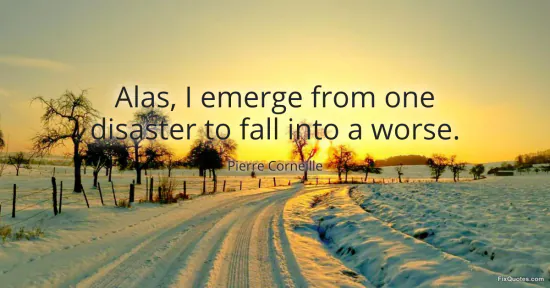Corneille, Pierre. (2026, January 16). Alas, I emerge from one disaster to fall into a worse. FixQuotes. https://fixquotes.com/quotes/alas-i-emerge-from-one-disaster-to-fall-into-a-94434/