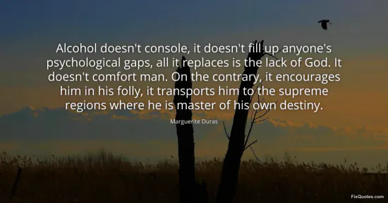 Duras, Marguerite. (2026, January 16). Alcohol doesn't console, it doesn't fill up anyone's psychological gaps, all it replaces is the lack of God. It doesn't comfort man. On the contrary, it encourages him in his folly, it transports him to the supreme regions where he is master of his own destiny. FixQuotes. https://fixquotes.com/quotes/alcohol-doesnt-console-it-doesnt-fill-up-anyones-95287/