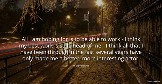 Rourke, Mickey. "All I am hoping for is to be able to work - I think my best work is still ahead of me - I think all that I have been through in the last several years have only made me a better, more interesting actor." FixQuotes. January 17, 2026. https://fixquotes.com/quotes/all-i-am-hoping-for-is-to-be-able-to-work-i-58330/.