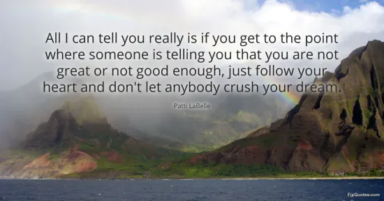 LaBelle, Patti. (2026, January 17). All I can tell you really is if you get to the point where someone is telling you that you are not great or not good enough, just follow your heart and don't let anybody crush your dream. FixQuotes. https://fixquotes.com/quotes/all-i-can-tell-you-really-is-if-you-get-to-the-76843/