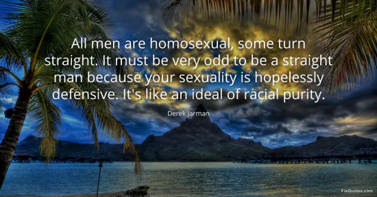 Jarman, Derek. (2026, January 16). All men are homosexual, some turn straight. It must be very odd to be a straight man because your sexuality is hopelessly defensive. It's like an ideal of racial purity. FixQuotes. https://fixquotes.com/quotes/all-men-are-homosexual-some-turn-straight-it-must-110716/