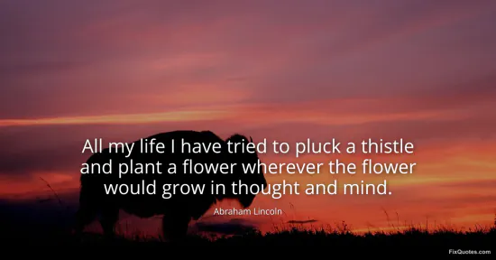 Lincoln, Abraham. "All my life I have tried to pluck a thistle and plant a flower wherever the flower would grow in thought and mind." FixQuotes. January 17, 2026. https://fixquotes.com/quotes/all-my-life-i-have-tried-to-pluck-a-thistle-and-24753/.