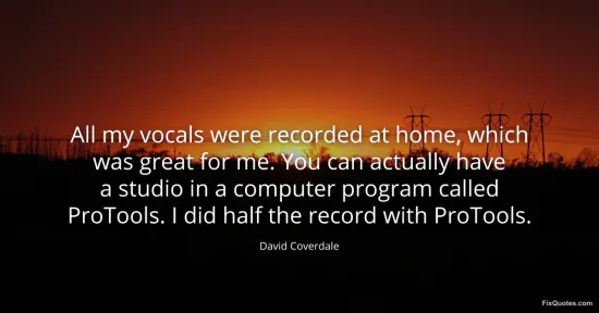 Coverdale, David. (2026, January 16). All my vocals were recorded at home, which was great for me. You can actually have a studio in a computer program called ProTools. I did half the record with ProTools. FixQuotes. https://fixquotes.com/quotes/all-my-vocals-were-recorded-at-home-which-was-135023/