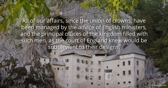 "All of our affairs, since the union of crowns, have been managed by the advice of English ministers, and the principal offices of the kingdom filled with such men, as the court of England knew would be subservient to their designs." FixQuotes, 16 Jan. 2026, https://fixquotes.com/quotes/all-of-our-affairs-since-the-union-of-crowns-have-131781/. Accessed 13 Feb. 2026.