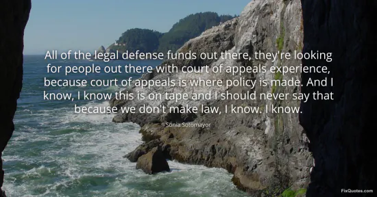 Sotomayor, Sonia. "All of the legal defense funds out there, they're looking for people out there with court of appeals experience, because court of appeals is where policy is made. And I know, I know this is on tape and I should never say that because we don't make law, I know. I know." FixQuotes. January 17, 2026. https://fixquotes.com/quotes/all-of-the-legal-defense-funds-out-there-theyre-72339/.