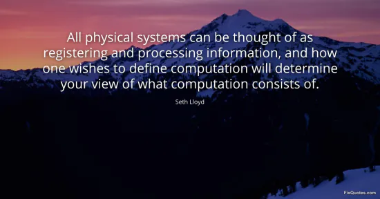 Lloyd, Seth. "All physical systems can be thought of as registering and processing information, and how one wishes to define computation will determine your view of what computation consists of." FixQuotes. January 16, 2026. https://fixquotes.com/quotes/all-physical-systems-can-be-thought-of-as-102949/.