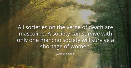 Greer, Germaine. "All societies on the verge of death are masculine. A society can survive with only one man; no society will survive a shortage of women." FixQuotes. January 17, 2026. https://fixquotes.com/quotes/all-societies-on-the-verge-of-death-are-masculine-47832/.