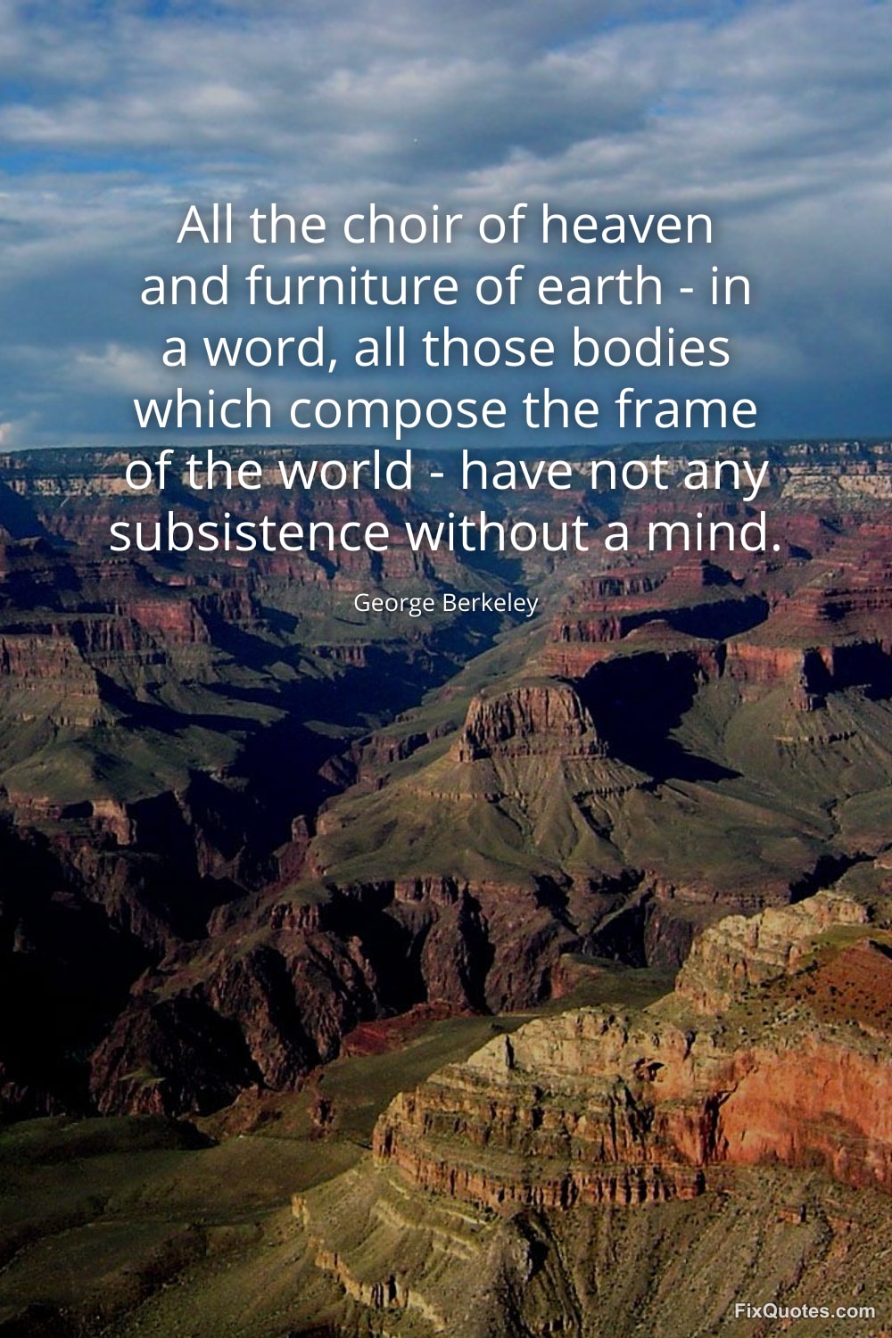 "All the choir of heaven and furniture of earth - in a word, all those bodies which compose the frame of the world - have not any subsistence without a mind." FixQuotes, 15 Jan. 2026, https://fixquotes.com/quotes/all-the-choir-of-heaven-and-furniture-of-earth-84238/. Accessed 18 Feb. 2026.