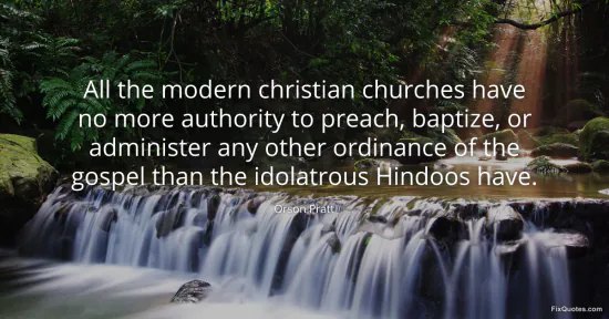 Pratt, Orson. "All the modern christian churches have no more authority to preach, baptize, or administer any other ordinance of the gospel than the idolatrous Hindoos have." FixQuotes. January 18, 2026. https://fixquotes.com/quotes/all-the-modern-christian-churches-have-no-more-9820/.
