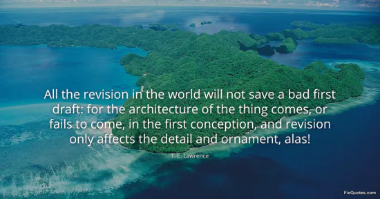 Lawrence, T. E. "All the revision in the world will not save a bad first draft: for the architecture of the thing comes, or fails to come, in the first conception, and revision only affects the detail and ornament, alas!" FixQuotes. January 16, 2026. https://fixquotes.com/quotes/all-the-revision-in-the-world-will-not-save-a-bad-99220/.