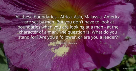 Olajuwon, Hakeem. (2026, January 15). All these boundaries - Africa, Asia, Malaysia, America - are set by men. But you don't have to look at boundaries when you are looking at a man - at the character of a man. The question is: What do you stand for? Are you a follower, or are you a leader? FixQuotes. https://fixquotes.com/quotes/all-these-boundaries-africa-asia-malaysia-158377/