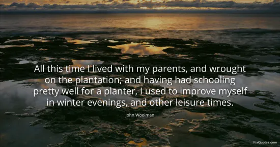 Woolman, John. (2026, January 15). All this time I lived with my parents, and wrought on the plantation; and having had schooling pretty well for a planter, I used to improve myself in winter evenings, and other leisure times. FixQuotes. https://fixquotes.com/quotes/all-this-time-i-lived-with-my-parents-and-wrought-164045/