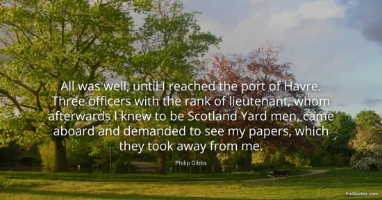 Gibbs, Philip. (2026, February 18). All was well, until I reached the port of Havre. Three officers with the rank of lieutenant, whom afterwards I knew to be Scotland Yard men, came aboard and demanded to see my papers, which they took away from me. FixQuotes. https://fixquotes.com/quotes/all-was-well-until-i-reached-the-port-of-havre-91429/
