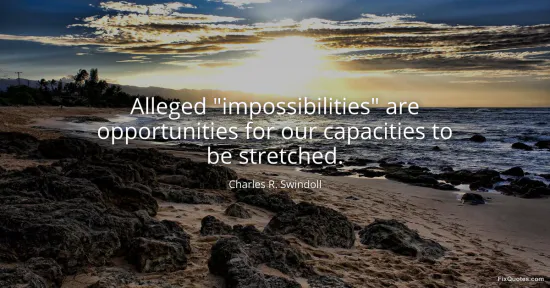 “Alleged” does the heavy lifting here. Swindoll isn’t merely offering pep-talk optimism; he’s staging a quiet cross-examination of the word “impossible” itself. By putting it in scare quotes, he treats the label as a social verdict more than a physical law, something handed down by fear, habit, or other people’s small imaginations. The line doesn’t deny limits outright. It denies the certainty with which we announce them.
