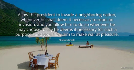 Lincoln, Abraham. (2026, January 15). Allow the president to invade a neighboring nation, whenever he shall deem it necessary to repel an invasion, and you allow him to do so whenever he may choose to say he deems it necessary for such a purpose - and you allow him to make war at pleasure. FixQuotes. https://fixquotes.com/quotes/allow-the-president-to-invade-a-neighboring-24755/