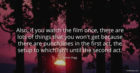 Pegg, Simon. "Also, if you watch the film once, there are lots of things that you won't get because there are punch lines in the first act, the setup to which isn't until the second act." FixQuotes. January 15, 2026. https://fixquotes.com/quotes/also-if-you-watch-the-film-once-there-are-lots-of-164998/.