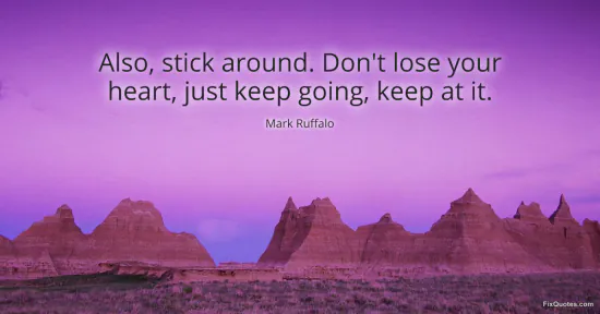 Ruffalo, Mark. (2026, January 15). Also, stick around. Don't lose your heart, just keep going, keep at it. FixQuotes. https://fixquotes.com/quotes/also-stick-around-dont-lose-your-heart-just-keep-156751/