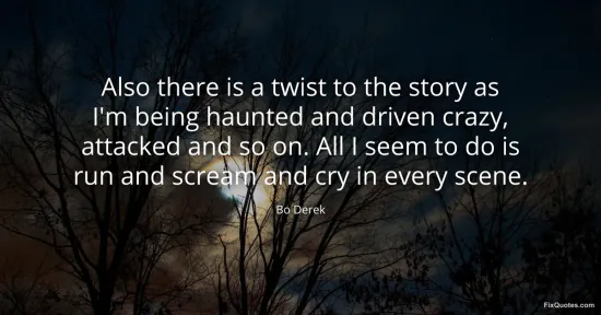 Derek, Bo. (2026, January 17). Also there is a twist to the story as I'm being haunted and driven crazy, attacked and so on. All I seem to do is run and scream and cry in every scene. FixQuotes. https://fixquotes.com/quotes/also-there-is-a-twist-to-the-story-as-im-being-49322/