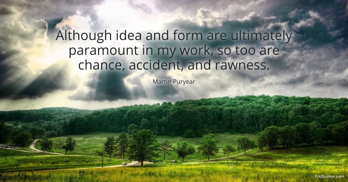 Puryear, Martin. (2026, January 16). Although idea and form are ultimately paramount in my work, so too are chance, accident, and rawness. FixQuotes. https://fixquotes.com/quotes/although-idea-and-form-are-ultimately-paramount-96833/