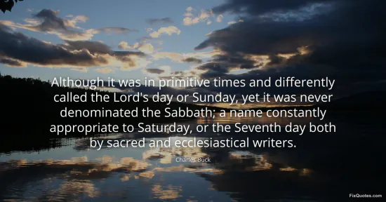 Buck, Charles. "Although it was in primitive times and differently called the Lord's day or Sunday, yet it was never denominated the Sabbath; a name constantly appropriate to Saturday, or the Seventh day both by sacred and ecclesiastical writers." FixQuotes. January 16, 2026. https://fixquotes.com/quotes/although-it-was-in-primitive-times-and-122944/.