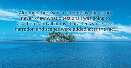 "Although there was a screenplay, the actors never knew what questions I was going to ask them, and all of my character's voice-over narration and scenes were added after the fact." FixQuotes, 17 Jan. 2026, https://fixquotes.com/quotes/although-there-was-a-screenplay-the-actors-never-53855/. Accessed 12 Feb. 2026.