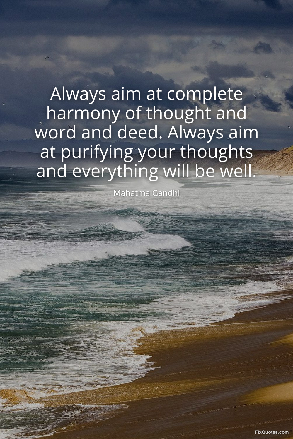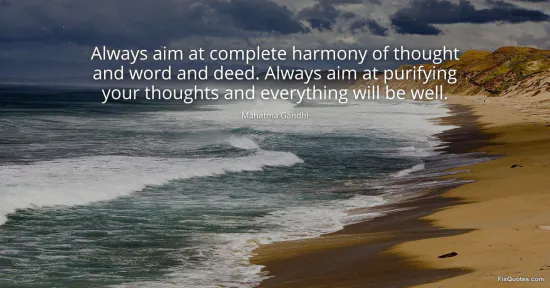 Gandhi, Mahatma. (2026, January 18). Always aim at complete harmony of thought and word and deed. Always aim at purifying your thoughts and everything will be well. FixQuotes. https://fixquotes.com/quotes/always-aim-at-complete-harmony-of-thought-and-13695/