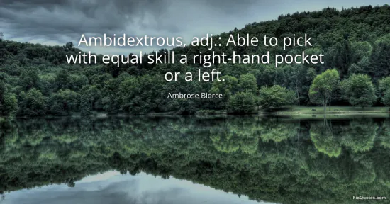 "Ambidextrous, adj.: Able to pick with equal skill a right-hand pocket or a left." FixQuotes, 14 Jan. 2026, https://fixquotes.com/quotes/ambidextrous-adj-able-to-pick-with-equal-skill-a-29763/. Accessed 12 Feb. 2026.