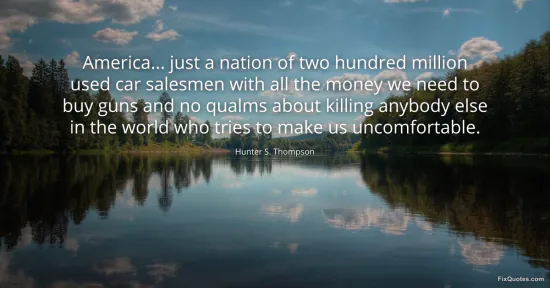 Thompson, Hunter S. "America... just a nation of two hundred million used car salesmen with all the money we need to buy guns and no qualms about killing anybody else in the world who tries to make us uncomfortable." FixQuotes. February 21, 2026. https://fixquotes.com/quotes/america-just-a-nation-of-two-hundred-million-used-31566/.