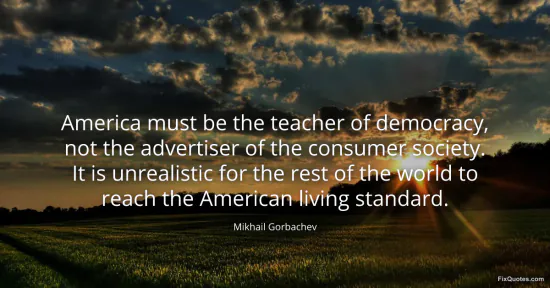 Gorbachev, Mikhail. (2026, January 16). America must be the teacher of democracy, not the advertiser of the consumer society. It is unrealistic for the rest of the world to reach the American living standard. FixQuotes. https://fixquotes.com/quotes/america-must-be-the-teacher-of-democracy-not-the-131318/