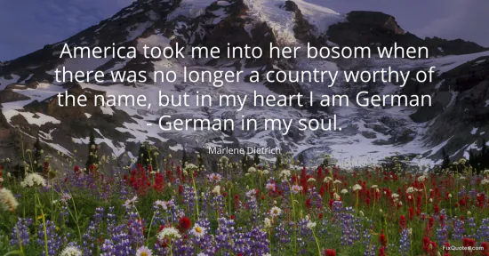 Dietrich, Marlene. "America took me into her bosom when there was no longer a country worthy of the name, but in my heart I am German - German in my soul." FixQuotes. January 16, 2026. https://fixquotes.com/quotes/america-took-me-into-her-bosom-when-there-was-no-108177/.
