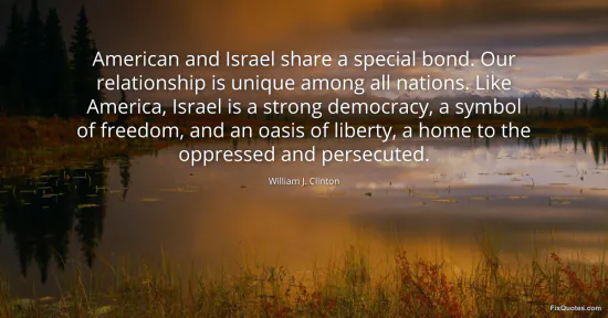Clinton, William J. "American and Israel share a special bond. Our relationship is unique among all nations. Like America, Israel is a strong democracy, a symbol of freedom, and an oasis of liberty, a home to the oppressed and persecuted." FixQuotes. January 16, 2026. https://fixquotes.com/quotes/american-and-israel-share-a-special-bond-our-99920/.