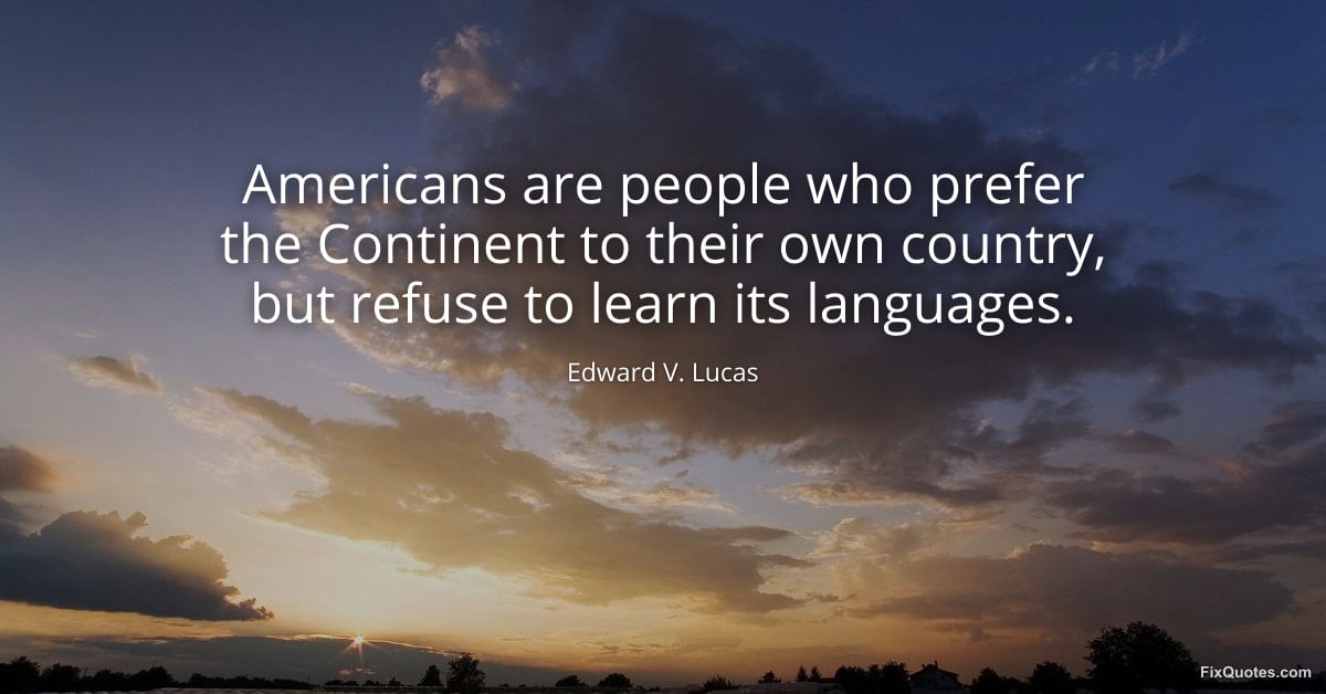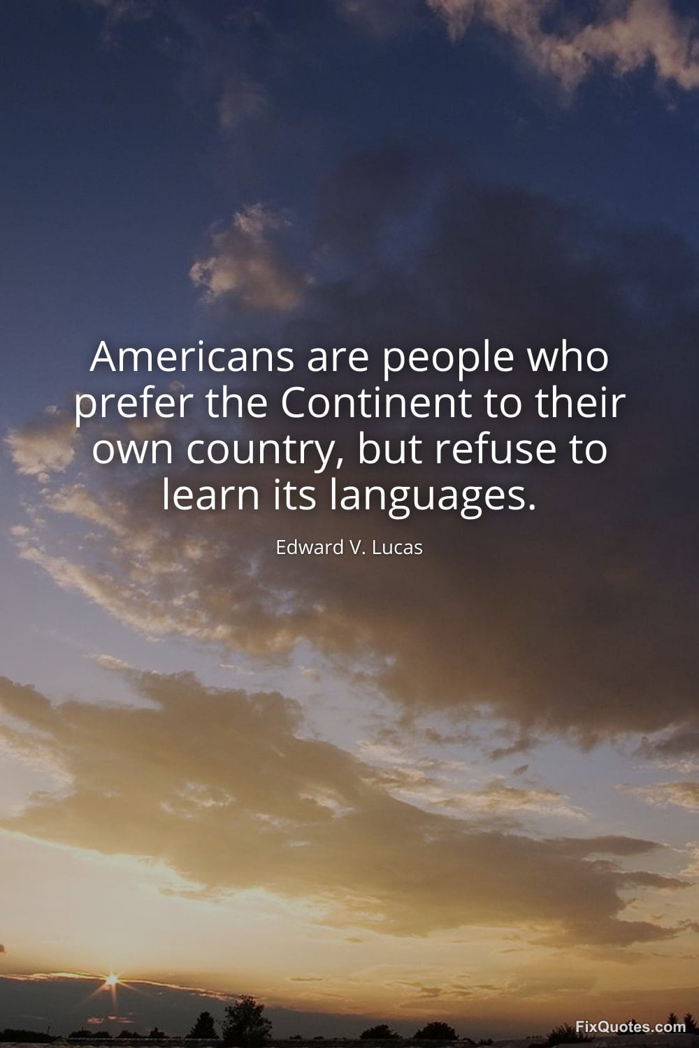 Lucas, Edward V. "Americans are people who prefer the Continent to their own country, but refuse to learn its languages." FixQuotes. January 16, 2026. https://fixquotes.com/quotes/americans-are-people-who-prefer-the-continent-to-135045/.