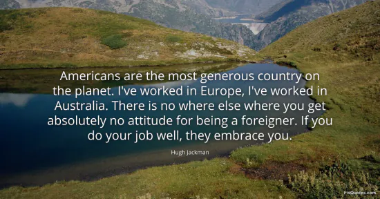 Jackman, Hugh. "Americans are the most generous country on the planet. I've worked in Europe, I've worked in Australia. There is no where else where you get absolutely no attitude for being a foreigner. If you do your job well, they embrace you." FixQuotes. January 16, 2026. https://fixquotes.com/quotes/americans-are-the-most-generous-country-on-the-108351/.