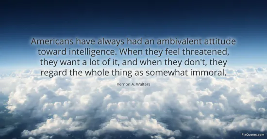 Walters, Vernon A. (2026, January 16). Americans have always had an ambivalent attitude toward intelligence. When they feel threatened, they want a lot of it, and when they don't, they regard the whole thing as somewhat immoral. FixQuotes. https://fixquotes.com/quotes/americans-have-always-had-an-ambivalent-attitude-105518/