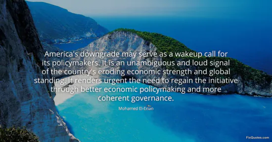 El-Erian, Mohamed. "America's downgrade may serve as a wakeup call for its policymakers. It is an unambiguous and loud signal of the country's eroding economic strength and global standing. It renders urgent the need to regain the initiative through better economic policymaking and more coherent governance." FixQuotes. January 16, 2026. https://fixquotes.com/quotes/americas-downgrade-may-serve-as-a-wakeup-call-for-108572/.