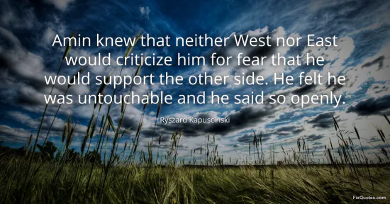 Kapuscinski, Ryszard. "Amin knew that neither West nor East would criticize him for fear that he would support the other side. He felt he was untouchable and he said so openly." FixQuotes. January 16, 2026. https://fixquotes.com/quotes/amin-knew-that-neither-west-nor-east-would-116586/.