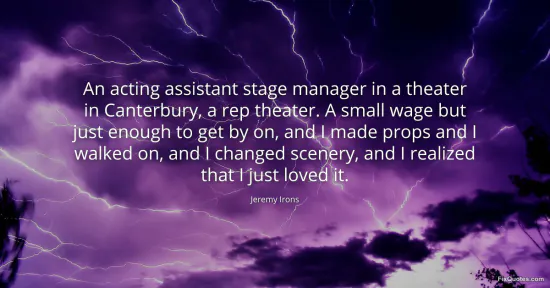 The list of tasks is the engine of the quote. Irons stacks verbs like a call sheet: made props, walked on, changed scenery. It’s deliberately unromantic. No mention of “craft,” no talk of destiny. The subtext is: artistry begins as logistics. By emphasizing the backstage ecosystem, he’s subtly demystifying acting as an isolated genius act and re-centering it as a collective enterprise where everyone touches the illusion.