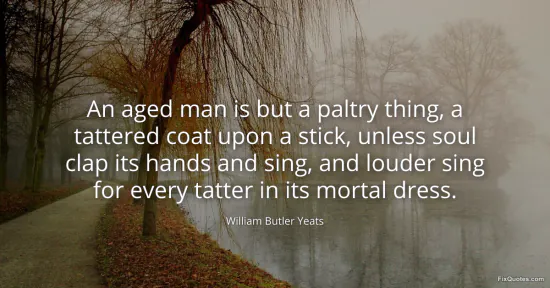 "An aged man is but a paltry thing, a tattered coat upon a stick, unless soul clap its hands and sing, and louder sing for every tatter in its mortal dress." FixQuotes, 18 Jan. 2026, https://fixquotes.com/quotes/an-aged-man-is-but-a-paltry-thing-a-tattered-coat-2374/. Accessed 21 Feb. 2026.