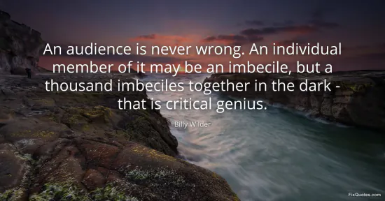 Wilder, Billy. (2026, January 15). An audience is never wrong. An individual member of it may be an imbecile, but a thousand imbeciles together in the dark - that is critical genius. FixQuotes. https://fixquotes.com/quotes/an-audience-is-never-wrong-an-individual-member-154393/