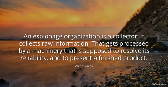Ames, Aldrich. "An espionage organization is a collector: it collects raw information. That gets processed by a machinery that is supposed to resolve its reliability, and to present a finished product." FixQuotes. January 17, 2026. https://fixquotes.com/quotes/an-espionage-organization-is-a-collector-it-37132/.