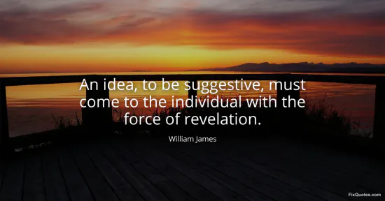 James, William. "An idea, to be suggestive, must come to the individual with the force of revelation." FixQuotes. January 18, 2026. https://fixquotes.com/quotes/an-idea-to-be-suggestive-must-come-to-the-22118/.