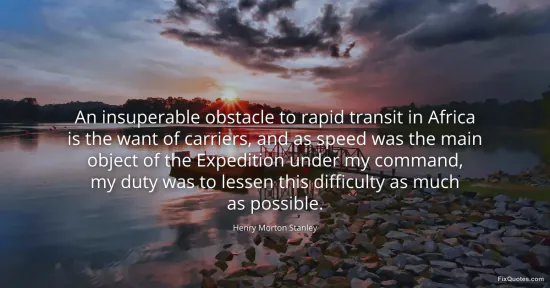 Stanley, Henry Morton. "An insuperable obstacle to rapid transit in Africa is the want of carriers, and as speed was the main object of the Expedition under my command, my duty was to lessen this difficulty as much as possible." FixQuotes. January 16, 2026. https://fixquotes.com/quotes/an-insuperable-obstacle-to-rapid-transit-in-112032/.